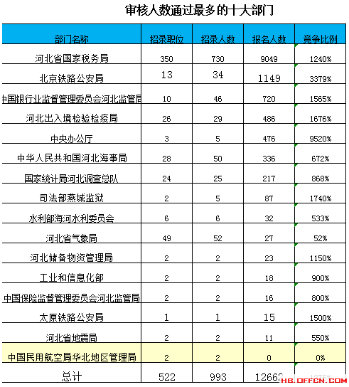 截止到20日8時,通過審核人數(shù)前三位的部門依次是:河北省國家稅務(wù)局、北京鐵路公安局、中國銀行業(yè)監(jiān)督管理委員會河北監(jiān)管局,三部門通過審核總?cè)藬?shù)達10918人,占通過審核總?cè)藬?shù)的86%。