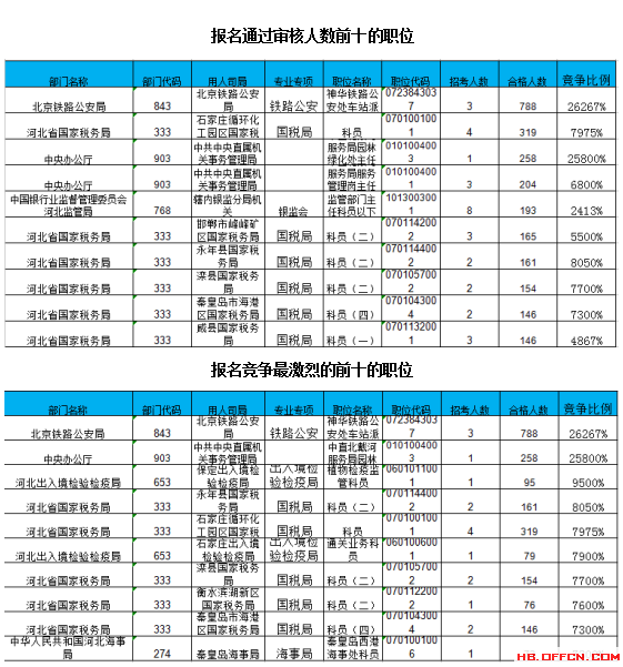 報名通過審核人數前十的職位主要集中在北京鐵路公安局、河北省國家稅務局、中央辦公廳等部門,具體信息如下: