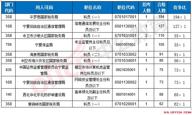 截止到20日8時,寧夏國考合格人數前三位的部門依次是:寧夏回族自治區國家稅務局、工業和信息化部、中國保險監督管理委員會寧夏監管局。