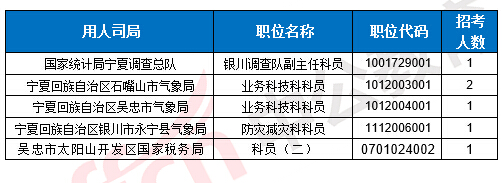 截止到20日8時,工作地點在寧夏的職位共有5個無人報考。下面是無人報考職位一覽表,中公網校專家建議廣大考生多關注一些較冷職位,避免激烈競爭,結合自身條件,找到屬于自己的職位。