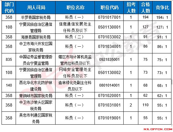 截止到20日8時,競爭比例的職位為平羅縣國家稅務局科員(一)一職,招錄1人,截止到20日8時合格人數為194人,具體信息如下: