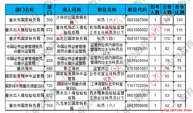 報名通過審核人數前十的職位主要集中在重慶市國家稅務局、重慶市出入境檢驗檢疫局等部門,具體信息如下: