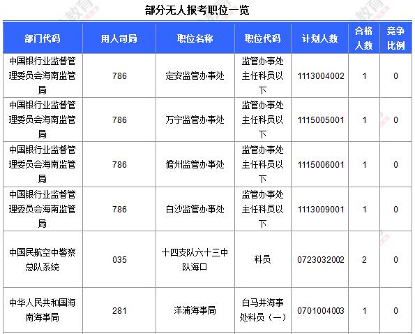 截止到20日16時,工作地點在海南的職位共有17個無人報考。海南中公網校提醒廣大考生,多關注無人報名職位,會大大降低競爭。
