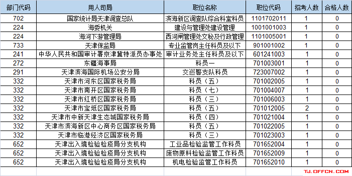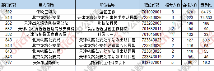 報名通過審核人數前十的職位主要集中在天津出入境邊防檢查總站、天津出入境檢驗檢疫局分支機構、保稅區海關,具體信息如下: