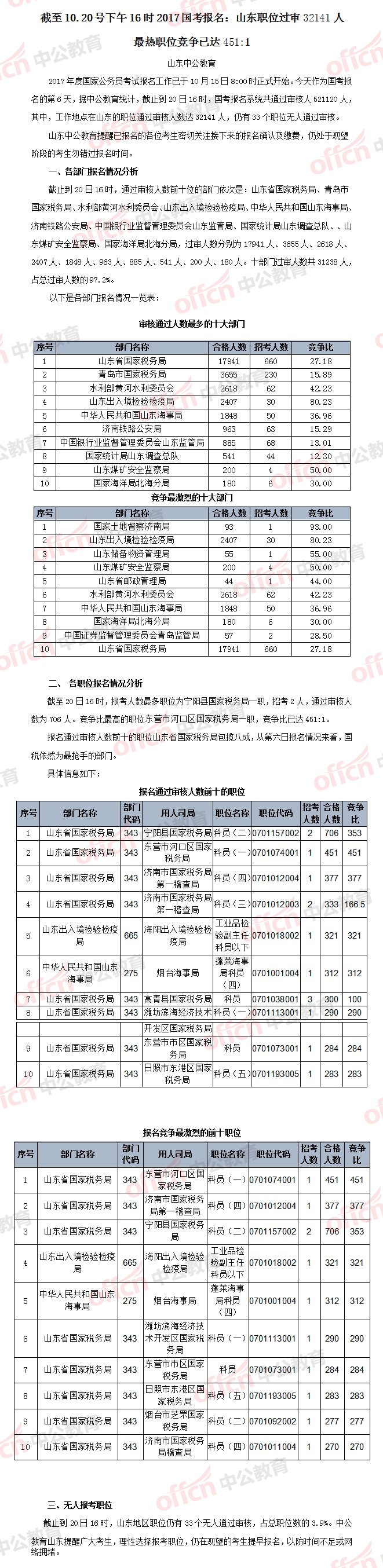 【截至20日16時】2017國考山東職位過審32141人 最熱職位競爭已達451:1