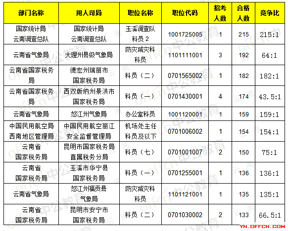 截止20日16時,競爭最激烈的職位為國家統計局云南調查總隊_國家統計局云南調查總隊(玉溪調查隊科員2),職位代碼1001725005,招錄1人,通過人數為215人,215:1。