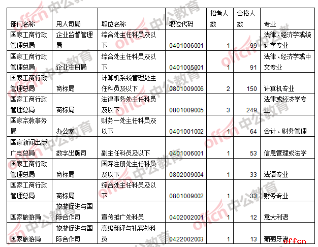 這些職位均不要求考生為服務基層服務人員,均來自中央國家行政機關(本級)或參照公務員法管理事業單位,不限政治面貌,要求考生學歷為本科以上,無任何備注要求,目前競爭比不足100:1,且面試比例為5:1,機會較高。除了國家旅游局旅游促進與國際合作司高級翻譯與禮賓處科員一職對工作經驗無限制以外,其余職位均只要求2年基層工作經歷,且這些職位覆蓋了法律、經濟學、中文、財務、計算機、小語種等范圍較廣的專業,相信符合條件的考生能從這些職位中找到適合自己的職位。