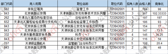 報名通過審核人數前十的職位主要集中在保稅區海關、北京鐵路公安局、天津出入境邊防檢查總站,具體信息如下: