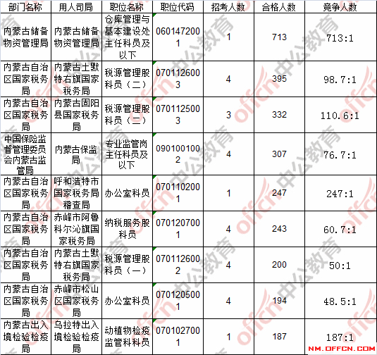 截止到21日8時,競爭比例的職位為內蒙古儲備物資管理局倉庫管理與基本建設處主任科員及以下一職,招錄1人,截止到21日8時通過人數為713人,競爭比例達到713:1!