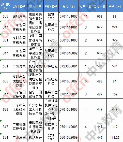 為幫助廣大考生更清晰的了解今日報名情況,廣東中公網校整理了審核通過人數前十位的部門以及競爭比例最激烈的十大部門,供廣大考生參考:
