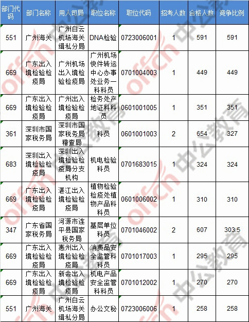 截止到21日8時,競爭比例的職位為廣州海關廣州白云機場海關緝私分局DNA檢驗一職,招錄1人,截止到21日8時通過人數為591人。
