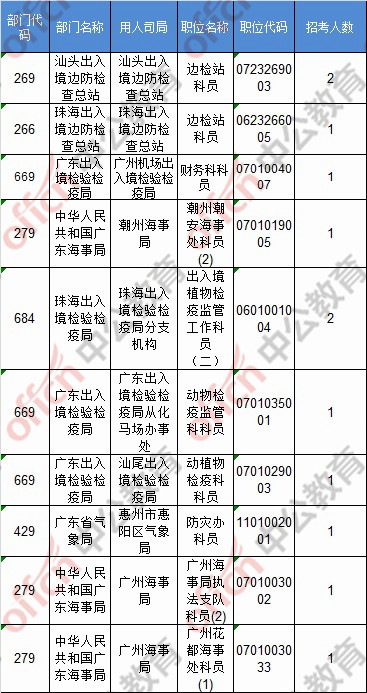 截止到21日8時,工作地點在廣東的職位共有51個無人報考,占全部職位的4.9%。下面是無人報考職位一覽表,中公網校專家建議廣大考生多關注一些較冷職位,避免激烈競爭,結合自身條件,找到屬于自己的職位。