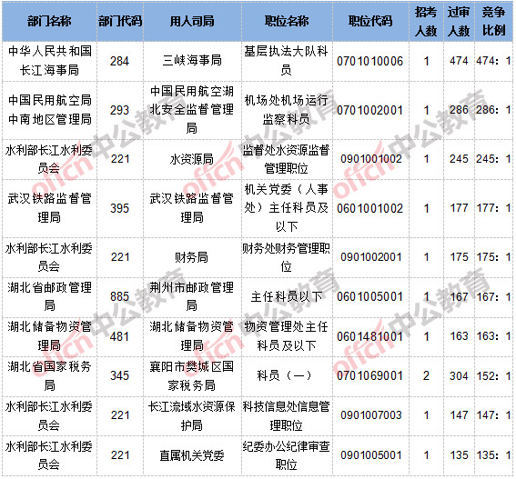 截止到10月21日8時,報名通過審核人數(shù)和競爭比例的職位為三峽海事局基層執(zhí)法大隊科員一職,招錄1人,過審人數(shù)474人,競爭比例為474:1。具體信息如下: