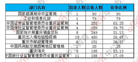 為幫助廣大考生更清晰的了解今日報名情況,重慶中公網校整理了審核通過人數前十位的部門以及競爭比例最激烈的十大部門,供廣大考生參考: