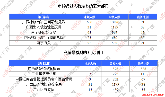 為幫助廣大考生更清晰的了解今日報名情況,廣西中公網校整理了審核通過人數前五位的部門以及競爭比例最激烈的五大部門,供廣大考生參考: