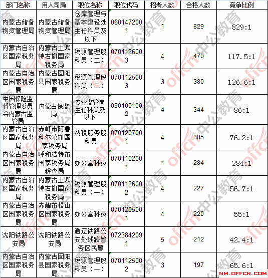 報名通過審核人數前十的職位主要集中在內蒙古儲備物資管理局、內蒙古固陽縣國家稅務局、內蒙古土默特右旗國家稅務局等部門,具體信息如下: