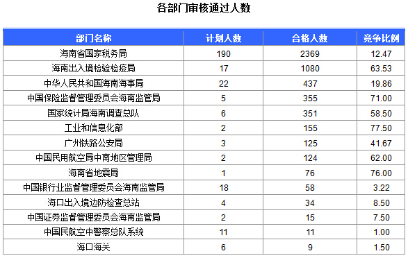 截止到21日16時,通過審核人數前三位的部門依次是:海南省國家稅務局、海南出入境檢驗檢疫局、中華人民共和國海南海事局,三部門通過審核總人數達3886人,占通過審核總人數的74.7%。