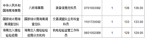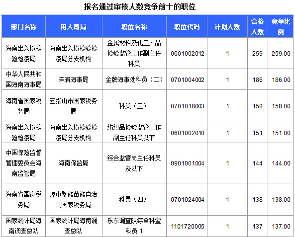 報名通過審核人數前十的職位主要集中在海南出入境檢驗檢疫局、海南省國家稅務局、中華人民共和國海南海事局等部門,具體信息如下:
