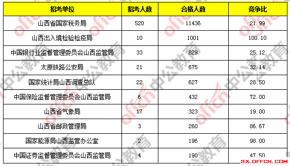 為幫助廣大考生更清晰的了解今日報名情況,山西中公網校整理了合格人數前十位的部門以及競爭比例最激烈的十大部門,供廣大考生參考: