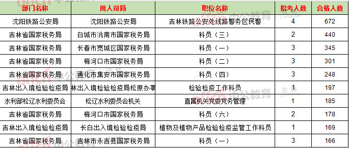 截止到21日16時(shí),競(jìng)爭(zhēng)比例的職位為吉林鐵路公安處線(xiàn)路警務(wù)區(qū)民警一職,招錄4人,截止到21日16時(shí)通過(guò)人數(shù)為672人。其次為吉林省國(guó)稅局部門(mén)。