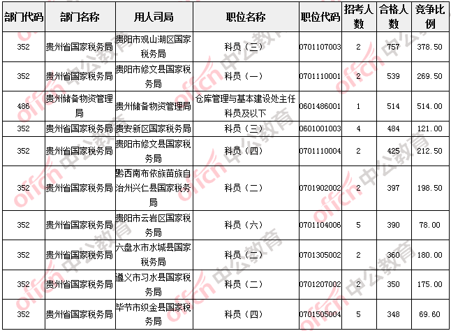 報(bào)名通過(guò)審核人數(shù)較多的職位主要集中在貴州省國(guó)家稅務(wù)局、貴州儲(chǔ)備物資管理局兩大部門(mén),具體信息如下: