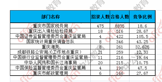 為幫助廣大考生更清晰的了解今日報名情況,重慶中公網校整理了審核通過人數前十位的部門以及競爭比例最激烈的十大部門,供廣大考生參考: