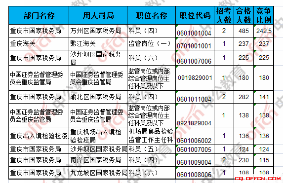 報名通過審核人數前十的職位主要集中在萬州區國家稅務局、渝北區國家稅務局、黔江海關等部門,具體信息如下: