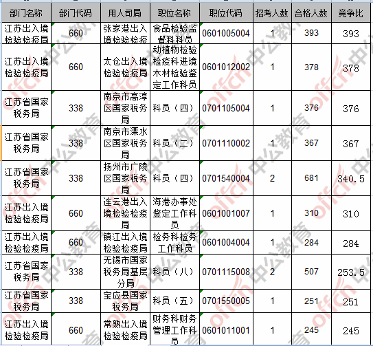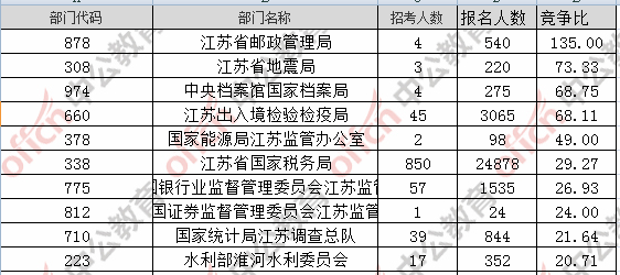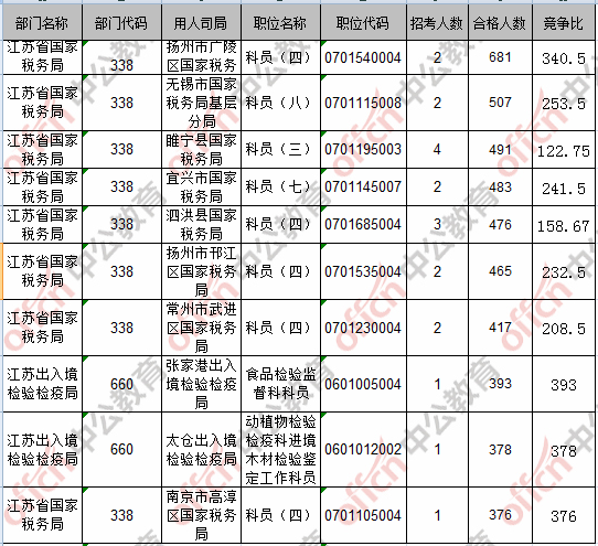 報名通過審核人數前十的職位主要集中在江蘇省國家稅務局、江蘇出入境檢驗檢疫局,具體信息如下: