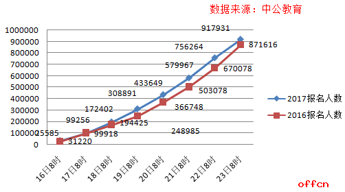 從2016國考報名跟2017國考報名對比走勢圖來看,今年報名總人數超去年已成定局,國考熱正在持續升溫。