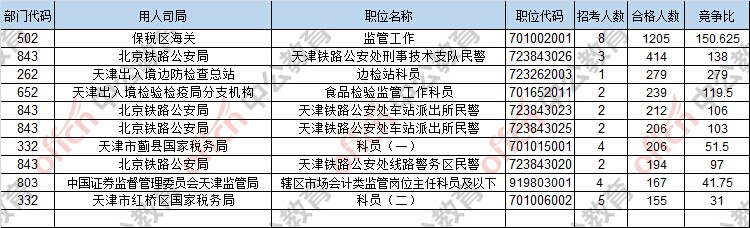 報名通過審核人數前十的職位主要集中在保稅區海關、北京鐵路公安局、天津出入境邊防檢查總站,具體信息如下: