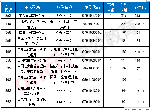 合格人數(shù)前十的職位主要集中在寧夏回族自治區(qū)國(guó)家稅務(wù)局、中國(guó)保險(xiǎn)監(jiān)督管理委員會(huì)寧夏監(jiān)管局、國(guó)家林業(yè)局等部門,具體信息如下: