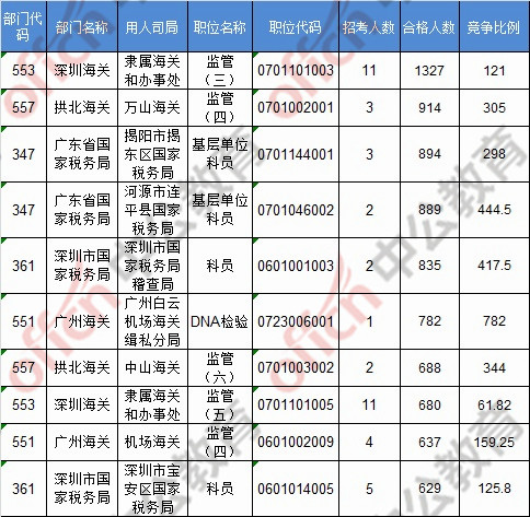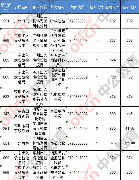 截止到23日8時,競爭比例的職位為廣州海關廣州白云機場海關緝私分局DNA檢驗一職,招錄1人,截止到23日8時通過人數為782人。