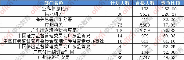 為幫助廣大考生更清晰的了解今日報名情況,廣東中公網校整理了審核通過人數前十位的部門以及競爭比例最激烈的十大部門,供廣大考生參考: