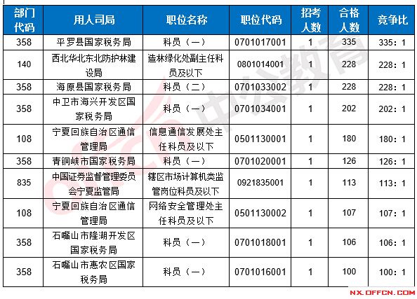 合格人數(shù)前十的職位主要集中在寧夏回族自治區(qū)國(guó)家稅務(wù)局、工業(yè)和信息化部、國(guó)家林業(yè)局等部門,具體信息如下: