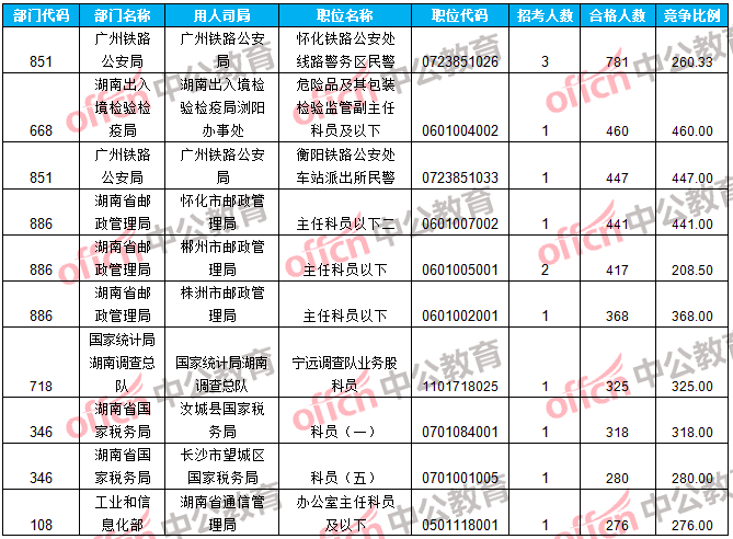 報(bào)名通過審核人數(shù)前十的職位主要集中在廣州鐵路公安局、湖南省郵政管理局等部門,具體信息如下: