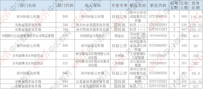 報名通過審核人數排名前列的職位主要集中在鄭州鐵路公安局、鄭州中牟縣國家稅務局,鄭州滎陽市國家稅務局,具體信息如下: