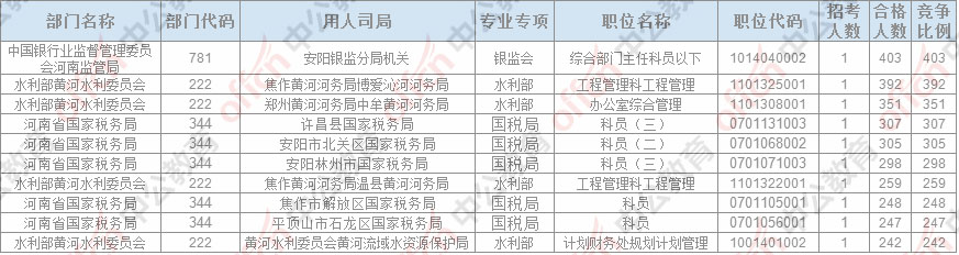 截止23日16時,招錄比例的職位為中公銀行業監督管理委員會河南監管局安陽銀監分局機關綜合部門主任科員以下一職,招錄1人,截止23日16時通過人數為403人。