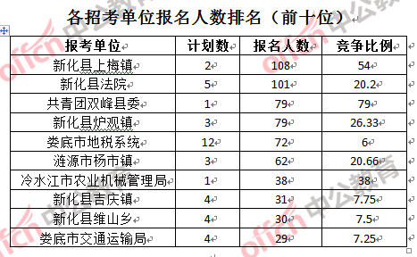 為幫助廣大考生更清晰的了解報名情況,中公教育整理了婁底市各招考單位的報名人數排名以及競爭比例排名,供廣大考生參考: