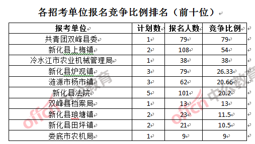競爭熱門招考單位,前三位依次是:共青團雙峰縣委(競爭比例79:1)、新化縣上梅鎮(競爭比例54:1)和冷水江市農業機械管理局(競爭比例38:1)。