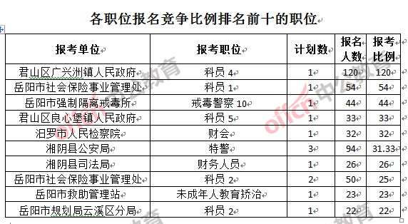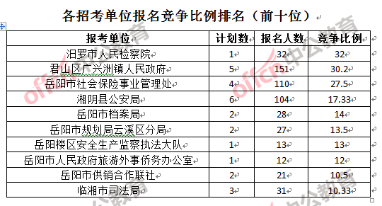 競(jìng)爭(zhēng)熱門招考單位,前三位依次是:汨羅市人民檢察院(競(jìng)爭(zhēng)比例32:1)、君山區(qū)廣興洲鎮(zhèn)人民政府(競(jìng)爭(zhēng)比例30.2:1)和岳陽(yáng)市社會(huì)保險(xiǎn)事業(yè)管理處(競(jìng)爭(zhēng)比例27.5:1)。