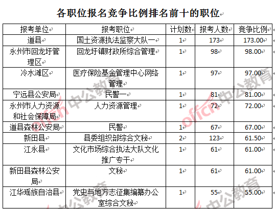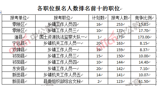為幫助廣大考生更清晰的了解報名情況,中公教育整理了永州市各招考單位的報名人數(shù)排名以及競爭比例排名,供廣大考生參考: