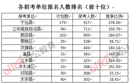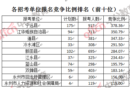 競爭熱門招考單位,前三位依次是:寧遠(yuǎn)縣(競爭比例378:1)、江華瑤族自治縣(競爭比例350:1)和道縣(競爭比例347:1)。
