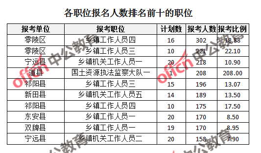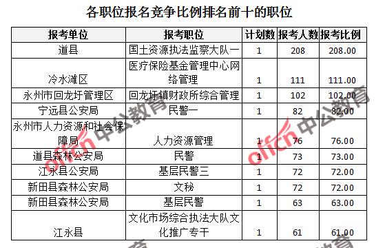 為幫助廣大考生更清晰的了解報(bào)名情況,中公網(wǎng)校整理了永州市各職位的報(bào)名人數(shù)排名以及競爭比例排名,供廣大考生參考: