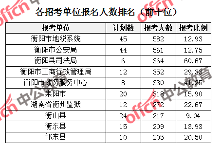 為幫助廣大考生更清晰的了解報(bào)名情況,中公網(wǎng)校整理了衡陽市各招考單位的報(bào)名人數(shù)排名以及競爭比例排名,供廣大考生參考: