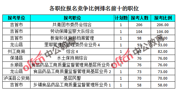 競爭熱門職位,前三位依次是:吉首市共青團市委員會綜合(競爭比例206:1)、吉首市勞動監察大隊綜合(競爭比例104:1)和吉首市教育和體育局檔案管理(競爭比例98:1)。