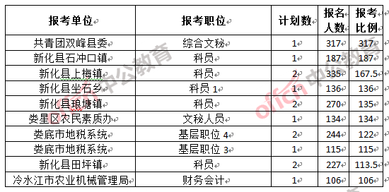 競爭熱門職位,前三位依次是:共青團雙峰縣委綜合文秘(競爭比例317:1)、新化縣石沖口鎮科員(競爭比例187:1)和新化縣上梅鎮科員(競爭比例167.5:1)。
