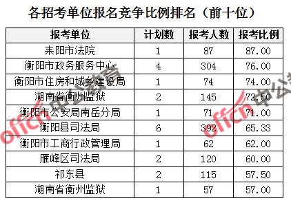 競爭熱門招考單位,前三位依次是:耒陽市法院(競爭比例87:1)、衡陽市政務服務中心(競爭比例76:1)和衡陽市住房和城鄉建設(競爭比例74:1)。