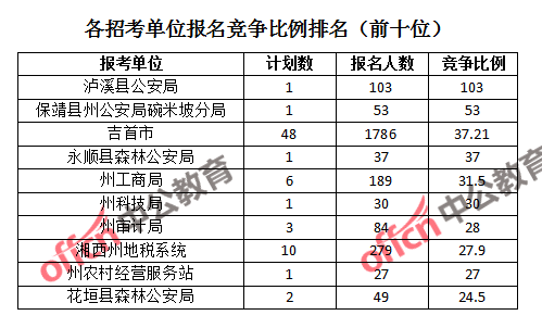 為幫助廣大考生更清晰的了解報名情況,中公網校整理了湘西州各招考單位的報名人數排名以及競爭比例排名,供廣大考生參考: