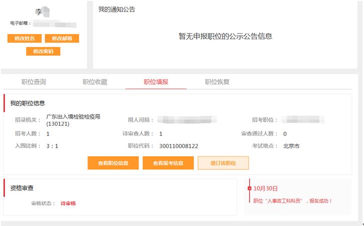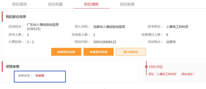 在報(bào)考完職位注意查看自己時(shí)候通過審核。報(bào)考人員請(qǐng)于2017年10月30日至11月10日期間登錄考錄專題網(wǎng)站查詢是否通過了資格審查。通過資格審查的,不能再報(bào)考其他職位。2017年10月30日8:00至11月8日18:00期間,報(bào)考申請(qǐng)尚未審查或未通過資格審查的,可以改報(bào)其他職位。2017年11月8日18:00至10日18:00期間,報(bào)考申請(qǐng)未審查或未通過資格審查的,不能再改報(bào)其他職位。