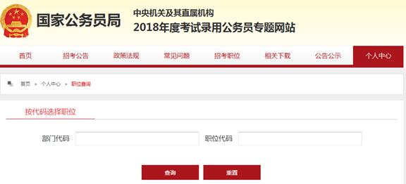 在選職位時首先需要輸入兩個代碼:部門代碼和職位代碼,考生要打開職位表,選出自己能報考的職位,把兩個代碼填寫完之后 點擊“查詢”,即可看到選報職位的詳細信息,如果輸入錯誤需要重新輸入,那樣的話點擊“重置”,就可以重新選擇。